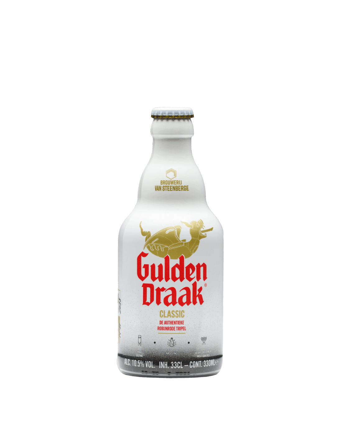 A un símbolo tan imponente, que ha perdurado durante más de seis siglos, le acompaña una cerveza igualmente impresionante. Como el dragón reina en lo alto de la ciudad, Gulden Draak figura desde hace años entre las mejores cervezas del mundo. Es una tripel oscura, lo que de por sí la convierte en una cerveza excepcional, pero su sabor complejo con toques de caramelo, malta tostada y café la hace única. En resumen, la cerveza hace honor a su nombre. Para la fermentación secundaria se utiliza una levadura vínica, que determina el incomparable sabor y garantiza la evolución del gusto a largo plazo (= cerveza viva). Cuanto más añeja es la cerveza, más aroma adquiere y más plenos se vuelven el sabor y el color. Por ello, merece la pena conservar algunas botellas grandes y dejarlas envejecer durante muchos años.