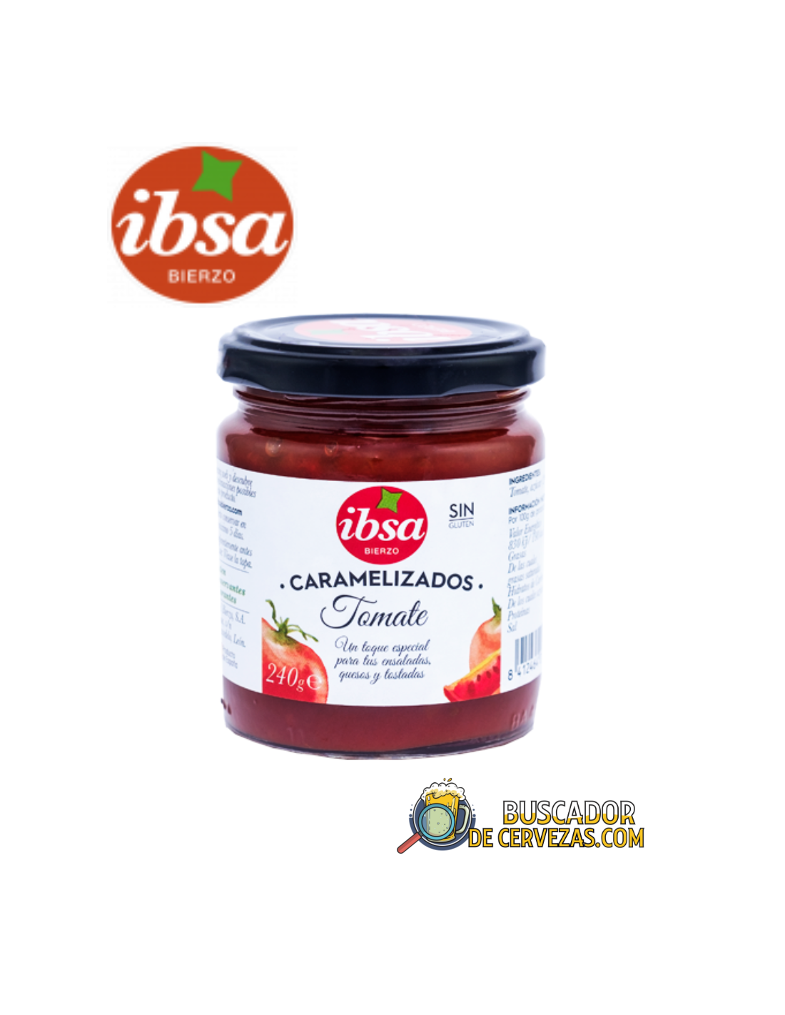 Tomate, açúcar (20%). Ideal para aperitivos e tostas. Experimente-o com lascas de presunto ibérico ou queijo de cabra. Também é perfeito como guarnição de carne ou peixe.